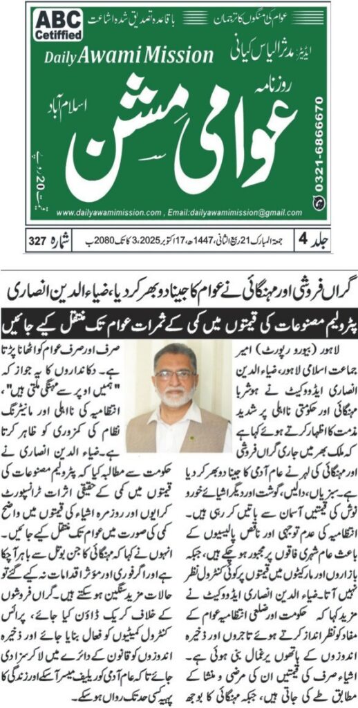 امیرجماعت اسلامی لاہورضیاءالدین انصاری ایڈووکیٹ ہوشربا مہنگائی پر انتظامیہ کی نااہلی کی شدید مذمت