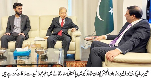 مشیر سرمایہ کاری بورڈ فیروز شاہ اور انجینئر فیضان شاہ ٹوکیو میں پاکستانی سفارتخانے میں سفیر عبدالحمید سے ملاقات کر رہے ہیں