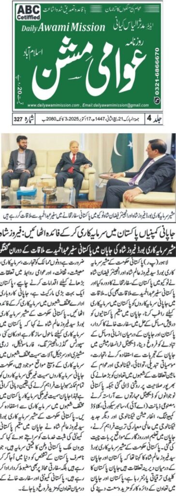 مشیر سرمایہ کاری بورڈ فیروز شاہ کی جاپان میںپاکستانی سفیر عبدالحمیدسے ملاقات کے دوران گفتگو