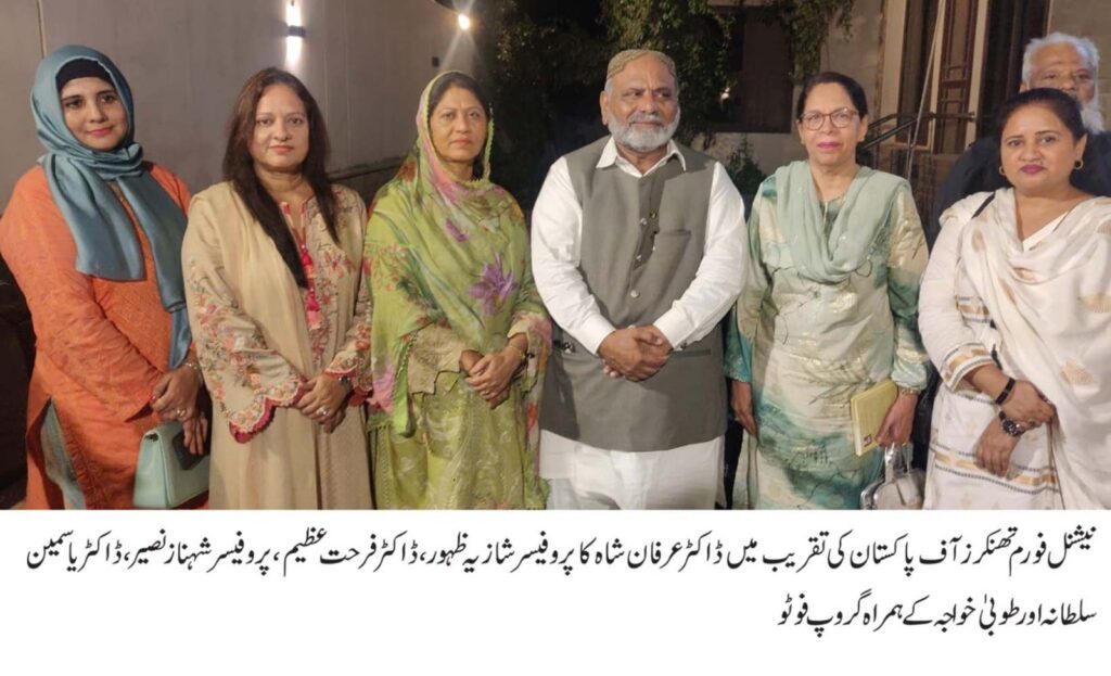 نیشنل فورم تھنکرز آف پاکستان کی تقریب میں ڈاکٹرعرفان شاہ کا پروفیسر شازیہ ظہور،ڈاکٹرفرحت عظیم ،پروفیسر شہناز نصیر،ڈاکٹریاسمین سلطانہ اورطوبیٰ خواجہ کے ہمراہ گروپ فوٹو