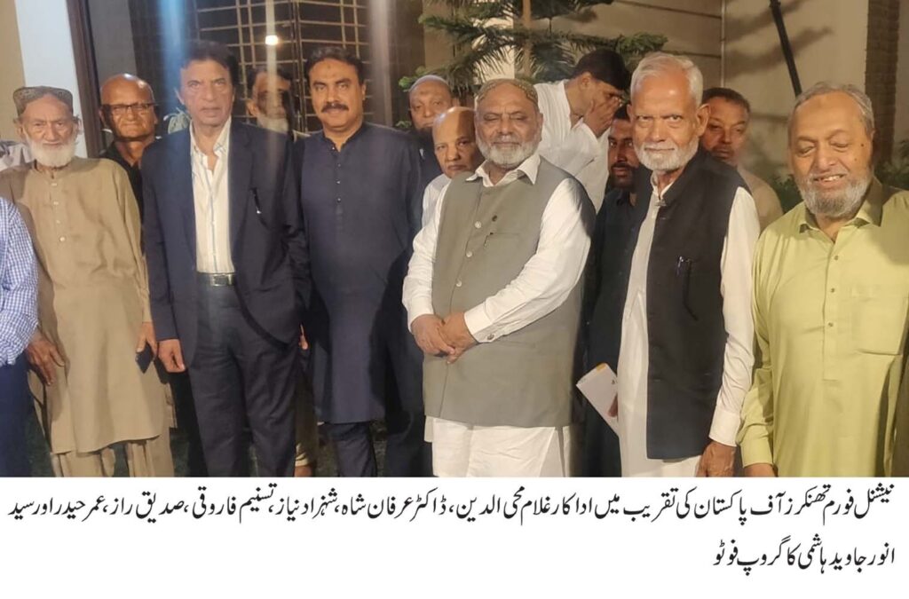 نیشنل فورم تھنکرز آف پاکستان کی تقریب میں اداکار غلام محی الدین، ڈاکٹرعرفان شاہ،شہزادنیاز،تسنیم فاروقی،صدیق راز،عمر حیدر اورسید انور جاوید ہاشمی کا گروپ فوٹو