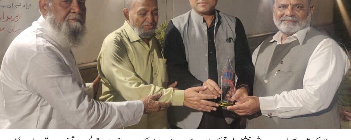 سابق رکن قومی اسمبلی ریحان ہاشمی، نیشنل فورم تھنکرز آف پاکستان کے جنرل سیکرٹری پروفیسر خواجہ قمر الحسن اورتسنیم فاروقی قابل ستائش تدریس اور ادبی خدمات کے عوض ڈاکٹر عرفان شاہ کو نشان کمال وفن پیش کررہے ہیں