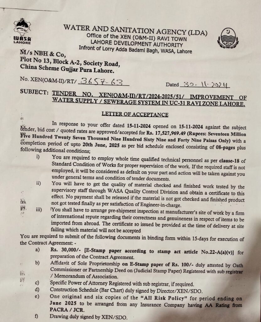 لاہور (نیوز انویسٹی گیشن سیل) محکمہ واسا لاہور کی راوی ٹائون 2ڈویژن میں ترقیاتی کاموں کے “ٹھیکے ونڈی دے لئی جاو” کی گونج ہر سوں پھیل گئی اختیارات کے ناجائز استعمال سے ایکسین و ماتحت عملہ سمیت بے نامی نان رجسٹرڈ ٹھیکیداروں کو ذاتی مالی فوائد جبکہ سرکاری خزانے کو بھاری نقصان ہونے پر بھی ہر سوں ہلچل مچ گئی تفصیلات کے مطابق راوی ٹائون O&M-2 ڈویژن کے ایکسین ذیشان منظور کی جانب سے اختیارات کا ناجائز استعمال اور نان رجسٹرڈ فرموں کو کروڑوں مالیت کے ٹھیکے ایوارڈ کرنے کا ہولناک انکشاف سامنے آیا ہے موصوف نے نومبر2024میں تین عدد ٹینڈرز جن کی ٹوٹل تخمینہ مالیت تقریباً05کروڑ تھی ایک بے نامی، نان رجسٹرڈ،بغیر PECلائسنس والی “NBH & Co” فرم کو ایوراڈ کئے حالانکہ اس فیک ،جعلی فرم کا ڈیٹا /رجسٹریشن کسی بھی سرکاری ادارے میں موجود ہی نہیں اور نہ اس نام کی فرم کے مالک کا شناختی کارڈ نمبر سمیت دیگر متعلقہ ڈیٹا کسی بھی ادارے میں موجود ہے موصوف نے ٹھیکہ دے کر اپنے گلے احتسابی پھندہ ڈالنے کا انتظام کر لیا افسوس در افسوس راوی ٹائون نمبر2 کے ایکسین نے کام بھی 2نمبر کرنے کا دانستہ غیر قانونی راج بنا رکھا ہے موصوف ذیشان منظور کی قلم سے فیک فرموں کے ٹھیکے منظور ہوتے چلے جا رہے ہیں وزیر اعلیٰ پنجاب سے اپیل کی جاتی ہے کہ اس کا نوٹس لیکر صاف شفاف انکوائری کروائی جائے اور خطیر رقم کی ریکوری کروا کر سرکاری خزانے میں جمع کروائی جائے اور ملزمان کو قانون کے مطابق قرار واقعی سزا دی جائے