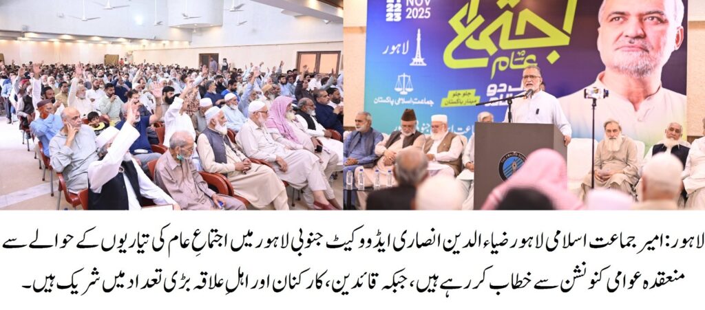 لاہور (عمرحیات چوہدری)امیر جماعت اسلامی لاہورضیاء الدین انصاری ایڈووکیٹ نے کہا ہے کہ قرآن و سنت کے نظام ہی سے عوامی مسائل حل ہوسکتے ہیں۔ موجودہ فرسودہ اور بدبودار نظام کے ہوتے ہوئے عوام کے دکھوں کا مداوا ممکن نہیں ہوسکتا۔ جماعت اسلامی ملک میں عدل، انصاف اور میرٹ کی بالادستی کے لیے پرعزم ہے۔انہوں نے کہا کہ کشمیر اور فلسطین کے مظلوم عوام کی جدوجہدِ آزادی میں جماعت اسلامی ہمیشہ ان کے شانہ بشانہ کھڑی رہی ہے اور رہے گی۔ ان خطوں کے مظلوم مسلمانوں کی حمایت ہمارے ایمان کا حصہ ہے۔ضیاء الدین انصاری ایڈووکیٹ نے کہا کہ جماعت اسلامی عدالتوں میں میرٹ پر فیصلوں اور ہر خاص و عام کے لیے یکساں قانون کے قیام کی جدوجہد کر رہی ہے۔ جماعت اسلامی ہی وہ واحد سیاسی اور دینی جماعت ہے جس نے عام آدمی کے سلگتے ہوئے مسائل کو ہر فورم پر اجاگر کیا ہے۔انہوں نے کہا کہ امیر جماعت اسلامی پاکستان حافظ نعیم الرحمن نے عوام کے بنیادی مسائل کے حل اور ملک میں عدل و انصاف کے قیام کے لیے اجتماعِ عام کا اعلان کیا ہے، کیونکہ جب تک نظام تبدیل نہیں ہوگا، عوام کے مسائل بھی حل نہیں ہوسکیں گے۔ان خیالا ت کا اظہار انہوں نے جنوبی لاہور میں اجتماع عام کی تیاریوں کے سلسلے میں منعقدہ ایک بڑے عوامی کنونشن سے خطاب کرتے ہوئے کہی۔ کنونشن میں نائب امیر جماعت اسلامی پاکستان لیاقت بلوچ، نائب امیر جماعت اسلامی لاہور خالد احمد بٹ، سابق ممبر قومی اسمبلی سید احسان اللہ وقاص، امیر جماعت اسلامی جنوبی لاہور مرزا عبدالرشیدسمیت بڑی تعداد میں قائدین، کارکنان اور اہلِ علاقہ نے شرکت کی۔کنونشن میں مقررین نے اس عزم کا اظہار کیا کہ جماعت اسلامی ملک میں اسلامی فلاحی نظامکے قیام، عوامی مسائل کے حل اور کشمیر و فلسطین کے مظلوم عوام کی آزادی کے لیے اپنی جدوجہد جاری رکھے گی۔