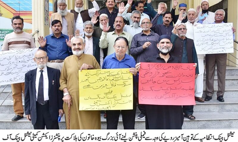 نیشنل بینک انتظامیہ کے توہین آمیز رویے کی وجہ سے فیملی پنشن لینے آئی بزرگ بیوہ خاتون کی ہلاکت پر پنشنرز ایکشن کمیٹی نیشنل بینک آف پاکستان کے زیر اہتمام احتجاجی مظاہرہ کیا جا رہا ہے