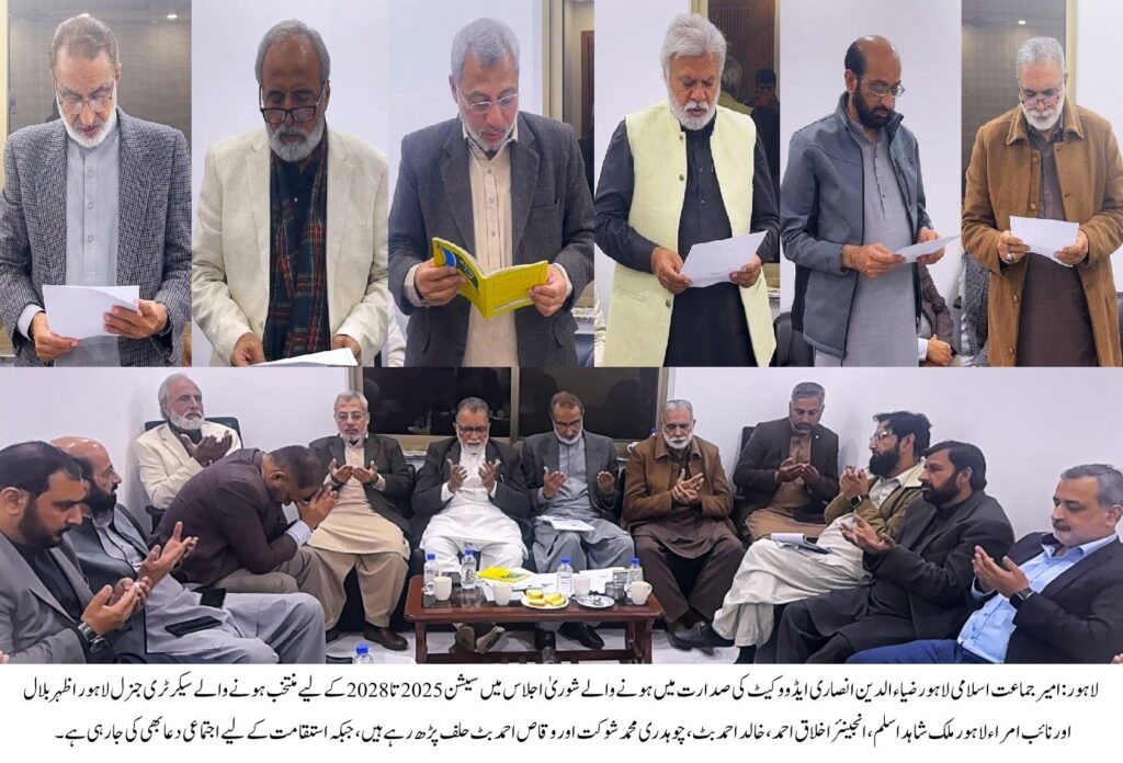 لاہور(عمرحیات چوہدری)جماعت اسلامی لاہور کی شوریٰ کا اہم اجلاس سید مودودی اسلامک سنٹرمیں منعقد ہوا جس کی صدارت امیر جماعت اسلامی لاہور ضیاء الدین انصاری ایڈووکیٹ نے کی۔ اجلاس میں تنظیمی امور، آئندہ لائحہ عمل اور جماعت کی کارکردگی پر تفصیلی غور و خوض کیا گیا۔ شوریٰ لاہور سے مشاورت کے بعد امیر جماعت اسلامی نے سیشن 2025 تا 2028 کے لیے جماعت اسلامی لاہور کے ذمہ داران کے تقرر کے اہم فیصلے کیے، جنہیں شوریٰ نے متفقہ طور پر منظور کیا۔اجلاس کے دوران اظہر بلال کو جماعت اسلامی لاہور کا سیکرٹری جنرل مقرر کیا گیا جنہوں نے امیر اور شوریٰ کے اراکین کے سامنے اپنی ذمہ داری کا باقاعدہ حلف اٹھایا۔ اسی طرح نائب امراء لاہور ملک شاہد اسلم، انجینئر اخلاق احمد، چوہدری محمد شوکت اور وقاص احمد بٹ نے بطور نائب امیر اپنے عہدوں کا حلف اٹھایا اور جماعت کی پالیسی، نظم و ضبط اور مشن کے مطابق کام کرنے کے عزم کا اظہار کیا۔ اس موقع پر تمام نو منتخب ذمہ داران نے اسلام کی سربلندی، معاشرے میں عدل و انصاف کے قیام اور عوامی خدمت کے لیے اپنی جدوجہد جاری رکھنے کا عہد دہرایا۔اجلاس سے خطاب کرتے ہوئے امیر جماعت اسلامی لاہور ضیاء الدین انصاری ایڈووکیٹ نے کہا کہ جماعت اسلامی ایک منظم، جمہوری اور مشاورتی نظام کے تحت آگے بڑھتی ہے، اسی لیے نئی باڈی کے ذمہ داران کا تقرر شوریٰ سے مکمل مشاورت کے بعد کیا گیا ہے۔ انہوں نے کہا کہ تمام ذمہ داران انتھک محنت، دیانت داری اور خدمتِ خلق کے جذبے کے ساتھ اپنی ذمہ داریاں نبھائیں گے اور لاہور کے عوام کے مسائل کے حل کے لیے مؤثر کردار ادا کریں گے۔امیر جماعت اسلامی لاہور نے اجلاس میں بلدیاتی ایکٹ کے خلاف جماعت اسلامی کے مؤقف کا بھی اعادہ کیا اور اعلان کیا کہ عوامی حقوق کے تحفظ کے لیے 21 دسمبر کو بھرپور تیاری کے ساتھ لاہور پریس کلب کے باہر احتجاجی دھرنا دیا جائے گا۔ انہوں نے کہا کہ جماعت اسلامی ہر فورم پر عوام کے حقوق کے لیے آواز بلند کرتی رہے گی اور منصفانہ بلدیاتی نظام کے قیام تک جدوجہد جاری رکھے گی۔