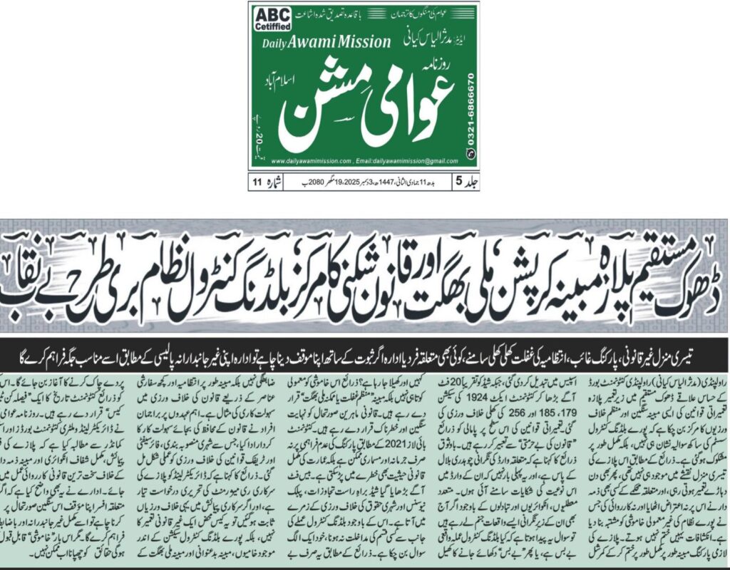 راولپنڈی (مدثر الیاس کیانی) راولپنڈی کنٹونمنٹ بورڈ کے حساس علاقے ڈھوک مستقیم میں زیرتعمیر پلازہ تعمیراتی قوانین کی ایسی مبینہ سنگین اور منظم خلاف ورزیوں کا مرکز بن چکا ہے کہ پورے بلڈنگ کنٹرول سسٹم کی ساکھ سوالیہ نشان ہی نہیں، بلکہ مکمل طور پر مشکوک ہو گئی ہے۔ ذرائع کے مطابق اس پلازے کی تیسری منزل نقشے میں موجود ہی نہیں تھی، پھر بھی دن دہاڑے تعمیر ہوتی رہی، اور متعلقہ محکمے کے کسی بھی ذمہ دار نے اس پر نہ اعتراض اٹھایا اور نہ کارروائی کی جس نے پورے نظام کی غیر معمولی خاموشی کو مشتبہ بنا دیا ہے۔انکشافات یہیں ختم نہیں ہوتے۔پلازے کی لازمی پارکنگ مبینہ طور پر مکمل طور پر ختم کر کے کمرشل اسپیس میں تبدیل کر دی گئی، جبکہ شیڈ کو تقریباً 20 فٹ آگے بڑھا کر کنٹونمنٹ ایکٹ 1924 کی سیکشن 179، 185 اور 256 کی کھلی خلاف ورزی کی گئی۔تعمیراتی قوانین کی اس سطح پر پامالی کو ذرائع ”قانون کی بے حرمتی“ سے تعبیر کر رہے ہیں۔باوثوق ذرائع کا کہنا ہے کہ متعلقہ وارڈ کی نگرانی چوہدری بلال کے پاس ہے، اور یہ پہلی بار نہیں کہ ان کے وارڈ میں اس نوعیت کی شکایات سامنے آئی ہوں۔ متعدد معطلیوں، انکوائریوں اور تبادلوں کے باوجود اگر آج بھی ان کے زیرِ نگرانی ایسے واقعات جنم لے رہے ہیں تو سوال یہ پیدا ہوتا ہے کہ کیا بلڈنگ کنٹرول عملہ واقعی بے بس ہے، یا پھر ”بے بس“ دکھائے جانے کا کھیل کہیں اور کھیلا جا رہا ہے؟ذرائع اس خاموشی کو معمولی کوتاہی نہیں بلکہ مبینہ ”منظم غفلت یا ممکنہ ملی بھگت“ قرار دے رہے ہیں۔قانونی ماہرین صورتحال کو نہایت سنگین اور خطرناک قرار دے رہے ہیں۔کنٹونمنٹ بائی لاز 2021 کے مطابق پارکنگ کی عدم فراہمی پر نہ صرف جرمانہ اور مسماری ممکن ہے بلکہ عمارت کی مکمل قانونی حیثیت بھی خطرے میں پڑ سکتی ہے۔ بیس فٹ آگے بڑھایا گیا شیڈ براہِ راست تجاوزات، پبلک نیوسنس اور شہری حقوق کی خلاف ورزی کے زمرے میں آتا ہے۔ اس کے باوجود بلڈنگ کنٹرول عملے کی جانب سے کسی قسم کی مداخلت نہ ہونا، خود ایک الگ سوال بن چکا ہے۔ذرائع کے مطابق یہ صرف بے ضابطگی نہیں بلکہ مبینہ طور پر انتظامیہ اور کچھ سفارشی عناصر کے ذریعے قانون کی خلاف ورزی میں سہولت کاری کی مثال ہے۔اہم عہدوں پر براجمان افراد نے قانون کے محافظ کی بجائے سہولت کار کا کردار ادا کیا، جس سے شہری منصوبہ بندی، فائر سیفٹی اور ٹریفک قوانین کی خلاف ورزی کو عملی شکل مل گئی۔ذرائع کا کہنا ہے کہ ڈائریکٹر لینڈ کو پلازے کی سرکاری ری میژرمنٹ کی تحریری درخواست تیار ہے، اور اگر سرکاری پیمائش میں یہی خلاف ورزیاں ثابت ہوگئیں تو یہ کیس محض ایک غیر قانونی تعمیر کا نہیں، بلکہ پورے بلڈنگ کنٹرول سیکشن کے اندر موجود خامیوں، مبینہ بدعنوانی اور مبینہ ملی بھگت کے پردے چاک کرنے کا آغاز بن جائے گا۔ اس کیس کو ذرائع کنٹونمنٹ تاریخ کا ایک ”فیصلہ کن ٹیسٹ کیس“ قرار دے رہے ہیں۔روزنامہ عوامی مشن نے ڈائریکٹر لینڈ و ملٹری کنٹونمنٹ بورڈز اور اسٹیشن کمانڈر سے مطالبہ کیا ہے کہ پلازے کی فوری پیمائش، مکمل شفاف انکوائری اور مبینہ ذمہ داران کے خلاف سخت ترین قانونی کارروائی عمل میں لائی جائے۔ ادارے نے یہ بھی واضح کیا ہے کہ اگر کوئی متعلقہ افسر اپنا مؤقف اس سنگین صورتحال پر پیش کرنا چاہے تو اسے مکمل غیر جانبدرانہ اور باضابطہ جگہ فراہم کرے گا۔مگر اس بار ”خاموشی“ قابلِ قبول نہیں ہو گی حقائق کو چھپانا اب ممکن نہیں۔