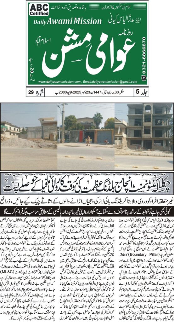 انچارج عظمت نے اس موقع پر واضح کیا کہ ستون نمبر چھ (Boundary Pillar) کا علاقہ چکلالہ کنٹونمنٹ بورڈ کے دائرہ اختیار میں آتا ہے اور یہاں ہونے والی تمام تعمیرات کنٹونمنٹ کے قوانین کے مطابق ہونی چاہئیں۔تاہم انہوں نے بتایا کہ متعلقہ عمارتوں کے نقشے راولپنڈی ڈویلپمنٹ اتھارٹی (آر ڈی اے) سے منظور شدہ ہیں کیونکہ آر ڈی اے اس علاقے کو اپنی حدود میں کلیم کرتا ہے۔اس ابہام کو دور کرنے کے لیے دونوں اداروں کے درمیان متعدد میٹنگز ہو چکی ہیں جبکہ معاملہ عدالت میں بھی زیرِ سماعت ہے۔انہوں نے مزید کہا کہ سی ای او چکلالہ کنٹونمنٹ بورڈ کے واضح احکامات کے مطابق زیرو ٹالرنس پالیسی پر عمل کیا جا رہا ہے اور بلڈنگ بائی لاز کی کسی بھی خلاف ورزی پر بلا امتیاز فوری کارروائی کی جائے گی،چاہے خلاف ورزی کرنے والا کتنا ہی بااثر کیوں نہ ہو۔علاقہ مکینوں اور شہریوں نے انچارج عظمت کے فیلڈ ایکشن اور دوٹوک مؤقف کو خوش آئند قرار دیتے ہوئے کہا کہ اگر اسی طرح ایمانداری، فیلڈ موجودگی اور زیرو ٹالرنس پالیسی کے تحت کام جاری رہا تو غیر قانونی تعمیرات کا خاتمہ ممکن ہو سکے گا اور کنٹونمنٹ بورڈ کو ریونیو نقصان سے بھی بچایا جا سکے گا۔ذرائع کے مطابق ماضی میں بلڈنگ سیکشن کے بعض اہلکار،جن میں ایریا انسپیکٹر اور سپر چیکر شامل ہیں، رشوت کے عوض غیر قانونی کمرشل دکانوں اور یونٹس کی اجازت دیتے رہے۔ابتدائی دنوں میں اپنے ہی افراد کو وردی پہنا کر تعینات کیا جاتا تھا تاکہ کوئی شہری،صحافی یا ادارہ سوال نہ اٹھا سکے۔ شہریوں کے مطابق جب ان غیر قانونی اقدامات پر اعتراض کیا جاتا تو کبھی کہا جاتا کہ متعلقہ افراد انچارج کے رشتہ دار ہیں اور کبھی مؤقف اختیار کیا جاتا کہ “ڈائریکٹر کی اجازت” حاصل ہے، جس کے باعث اصل شکایات دبائی جاتی رہیں اور قانون کی عملداری عملاً مفلوج ہو گئی۔مزید یہ بھی انکشاف ہوا کہ بعض انسپیکٹرز خود ہی ڈمی درخواستیں ادارے میں جمع کراتے تاکہ پارٹی سے زیادہ رقم وصول کی جا سکے۔ان غیر قانونی سرگرمیوں کے ذریعے کروڑوں روپے کمائے گئے اور نوٹوں کی چمک نے کنٹونمنٹ بورڈ کی ساکھ کو شدید نقصان پہنچایا، جس سے شہریوں میں یہ تاثر پیدا ہوا کہ قوانین صرف غریب اور بے بس افراد پر لاگو ہوتے ہیں جبکہ طاقتور افراد کے لیے سب کچھ “مینج” کر لیا جاتا ہے۔عوامی اور سماجی حلقوں نے وزارتِ دفاع، ملٹری لینڈز اینڈ کنٹونمنٹ ڈیپارٹمنٹ (ML&C) اور چکلالہ کنٹونمنٹ بورڈ کے سی ای او سے مطالبہ کیا ہے کہ ان سنگین بے ضابطگیوں کا بھی فوری نوٹس لیا جائے، باقاعدہ شفاف اور غیر جانبدارانہ انکوائری کرائی جائے اور ایسے اہلکاروں کو کیفر کردار تک پہنچایا جائے جنہوں نے ادارے کو نقصان پہنچا کر کروڑوں کی جائیدادیں بنائیں۔کوئی بھی چاہے تو شواہد کے ساتھ اپنا موقف دے سکتا ہے جسکو ادارہ اپنی غیر جانبدرانہ پالیسی کے مطابق مناسب جگہ فراہم کرے گا۔