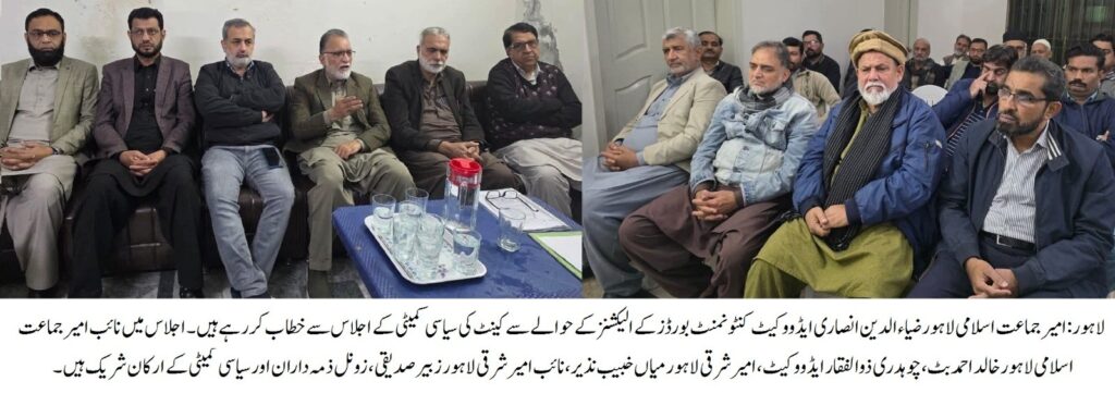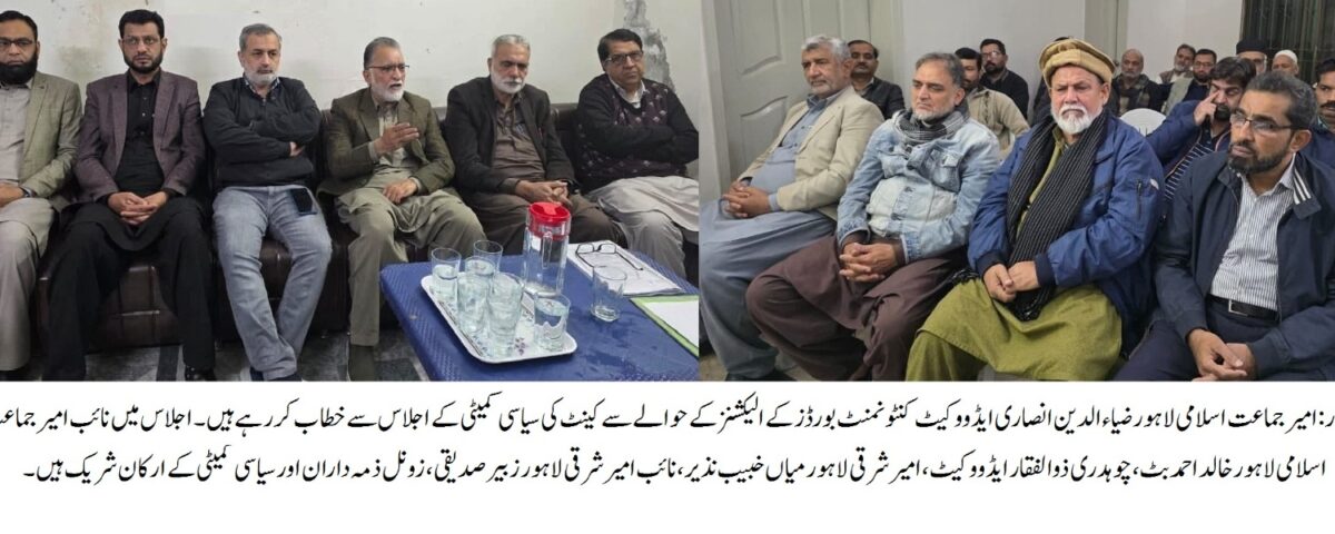 امیرجماعت اسلامی لاہورضیاءالدین انصاری ایڈووکیٹ کاکنٹونمنٹ بورڈز کے الیکشنز کے حوالے سے کینٹ کی سیاسی کمیٹی کے اجلاس خطاب