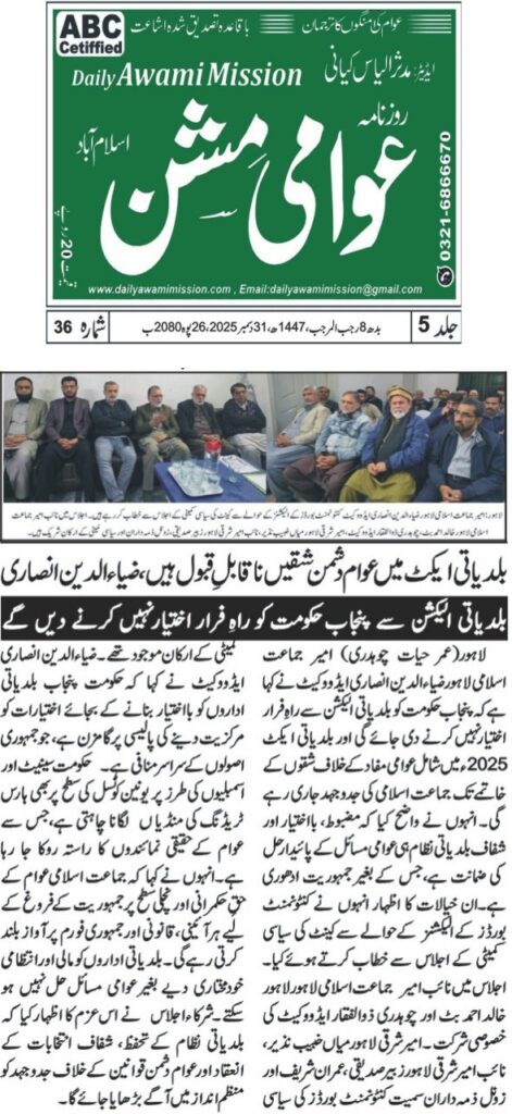 بلدیاتی ایکٹ 2025ء میں عوامی مفاد کی دشمن شقوں کے خاتمے تک جدوجہد جاری رہیگی۔