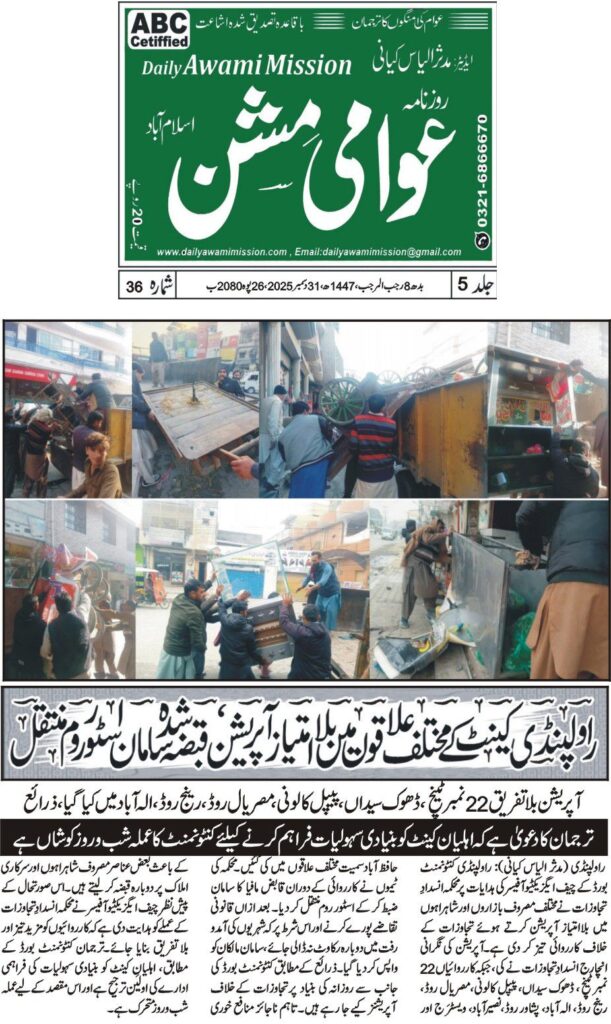 راولپنڈی (مدثر الیاس کیانی): راولپنڈی کنٹونمنٹ بورڈ کے چیف ایگزیکٹیو آفیسر کی ہدایات پر محکمہ انسدادِ تجاوزات نے مختلف مصروف بازاروں اور شاہراہوں میں بلاامتیاز آپریشن کرتے ہوئے تجاوزات کے خلاف کارروائی تیز کر دی ہے۔آپریشن کی نگرانی انچارج انسدادِ تجاوزات نے کی، جبکہ کارروائیاں 22 نمبر ٹینچ، ڈھوک سیداں، پیپل کالونی، مصریال روڈ، رینج روڈ، الہ آباد، پشاور روڈ، نصیرآباد، ویسٹرَج اور حافظ آباد سمیت مختلف علاقوں میں کی گئیں۔محکمہ کی ٹیموں نے کارروائی کے دوران قابض مافیا کا سامان ضبط کر کے اسٹور روم منتقل کر دیا۔ بعد ازاں قانونی تقاضے پورے کرنے اور اس شرط پر کہ شہریوں کی آمد و رفت میں دوبارہ رکاوٹ نہ ڈالی جائے، سامان مالکان کو واپس کر دیا گیا۔ذرائع کے مطابق کنٹونمنٹ بورڈ کی جانب سے روزانہ کی بنیاد پر تجاوزات کے خلاف آپریشنز کیے جا رہے ہیں۔ تاہم ناجائز منافع خوری کے باعث بعض عناصر مصروف شاہراہوں اور سرکاری املاک پر دوبارہ قبضہ کر لیتے ہیں۔اس صورتحال کے پیش نظر چیف ایگزیکٹیو آفیسر نے محکمہ انسدادِ تجاوزات کے عملے کو ہدایت دی ہے کہ کارروائیوں کو مزید تیز اور بلا تفریق بنایا جائے۔ترجمان کنٹونمنٹ بورڈ کے مطابق، اہلیانِ کینٹ کو بنیادی سہولیات کی فراہمی ادارے کی اولین ترجیح ہے اور اس مقصد کے لیے عملہ شب و روز متحرک ہے۔