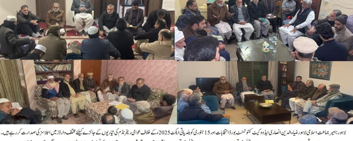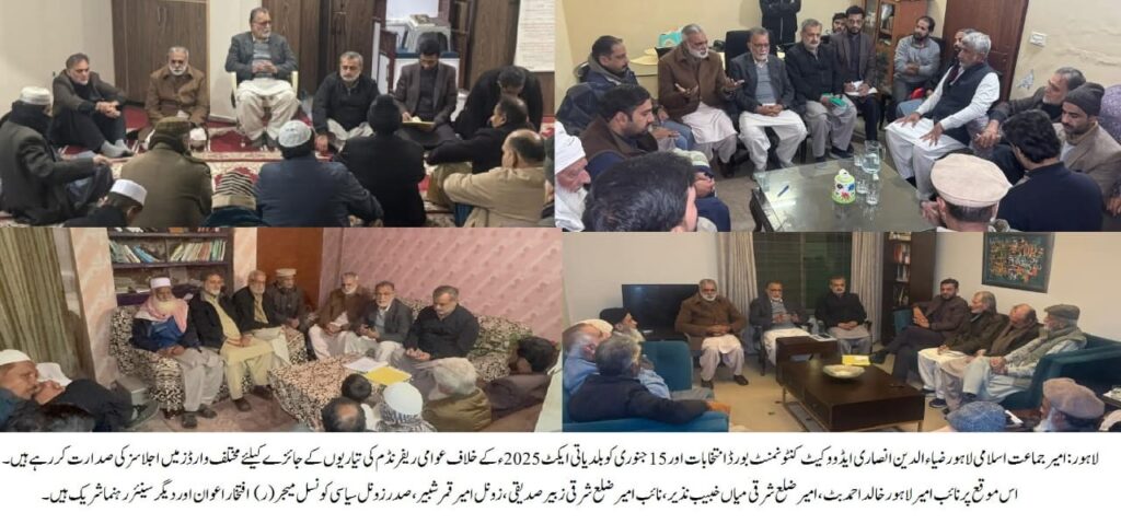 لاہور(عمرحیات چوہدری)امیر جماعت اسلامی لاہور ضیاء الدین انصاری ایڈووکیٹ نے کہا کہ جماعت اسلامی بلدیاتی انتخابات میں اہل، دیانتدار اور باصلاحیت امیدواران لاہور کے عوام کو فراہم کرے گیا اور پنجاب حکومت کے بلدیاتی ایکٹ میں شامل عوام دشمن شقوں کے خلاف 15 جنوری 2026 سے عوامی ریفرنڈم کا آغاز کریں گے۔ اس ریفرنڈم میں مرد و خواتین، بوڑھے، جوان، طلبہ، مزدور اور کسان اس بلدیاتی کالے ایکٹ کے خلاف اپنی رائے پیش کریں گے۔ جماعت اسلامی اس عوامی ریفرنڈم کے ذریعے حکومت کے کالے قانون کے خلاف شعور و آگاہی بھی پھیلائے گی تاکہ عوام اپنے حقوق کے لیے متحد ہوں۔ ا ن خیالات کااظہار انہوں نے لاہور کنٹونمنٹ بورڈ کے بلدیاتی انتخابات کی تیاری کے لیے مختلف وارڈز اور زونز میں تنظیمی اجلاسز سے خطاب کرتےہوئے کیا۔ اجلاسوں میں نائب امیر لاہور خالد احمد بٹ، امیر ضلع شرقی میاں خبیب نذیر، نائب امیر ضلع شرقی زبیر صدیقی، زونل امیر قمر شبیر، صدر زونل سیاسی کونسل میجر (ر) افتخار اعوان اور دیگر سینئر رہنما شریک ہوئے۔اجلاسوں میں مختلف وارڈز کے انتخابی امور، امیدواروں کی قابلیت، اور عوامی رابطے کے طریقہ کار پر تفصیلی غور کیا گیا۔اجلاسوں میں عوامی رابطے اور انتخابات میں شفافیت کو یقینی بنانے کے لیے ایک مضبوط منصوبہ بندی کی گئی ۔ اس موقع پر امیر لاہور نے مقامی قیادت کوعوام کے مسائل، نمائندگی اور شفاف انتخاب کے حق کو ہر سطح پر یقینی بنانے کے لیے سرگرم عمل رہنے کی ہدایات بھی جاری کیں ۔