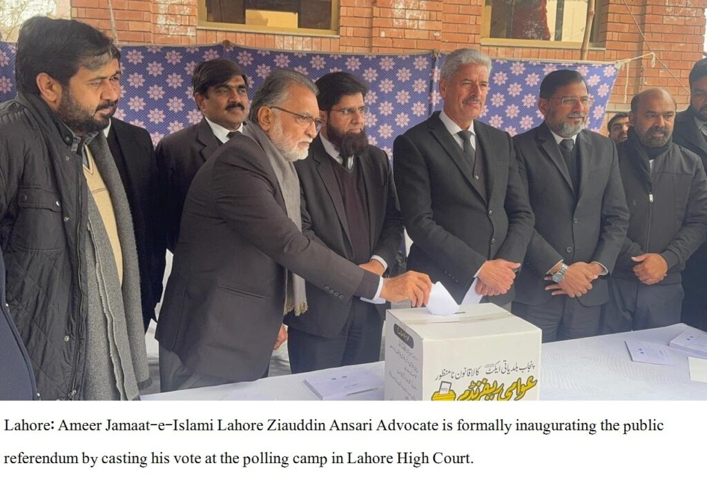 Lahore:Jamaat-e-Islami Lahore has launched a public referendum against the Local Government Act 2025, which will continue until January 18, 2026. The referendum was formally inaugurated by Ameer Jamaat-e-Islami Lahore, Advocate Zia-ud-Din Ansari, at a polling camp in Lahore High Court, where he also cast his vote. The inauguration was attended by prominent figures including President Lahore High Court Bar Malik Asif Ahmed Niswana, former President Shafqat Mahmood Chauhan, President Islamic Lawyers Movement Kaleem Javed, Mian Zia-ul-Hassan Advocate, and Deputy Secretaries Qaiser Sharif and Shahid Naveed Malik, all of whom supported the referendum and participated in voting. Across Lahore, 300 polling camp locations have been established, with men, women, and children actively participating, and voting will continue until 5:00 PM. Advocate Ansari stated that this referendum is a decisive expression of citizens’ opinions, urging every resident to participate fully to ensure local representation. Key polling locations include Multan Road, Mansoorah Bazaar, Model Bazaar, Wahdat Colony, Mehlanwal, Waris Colony, Islamia Park, Jinnah Colony, Barkat Town, Bilal Town, Raiwind, Shalimar Colony, College Road, and other prominent areas. He emphasized that the referendum is not for any single political party but represents a citizen-led effort to protect local governance and democracy.