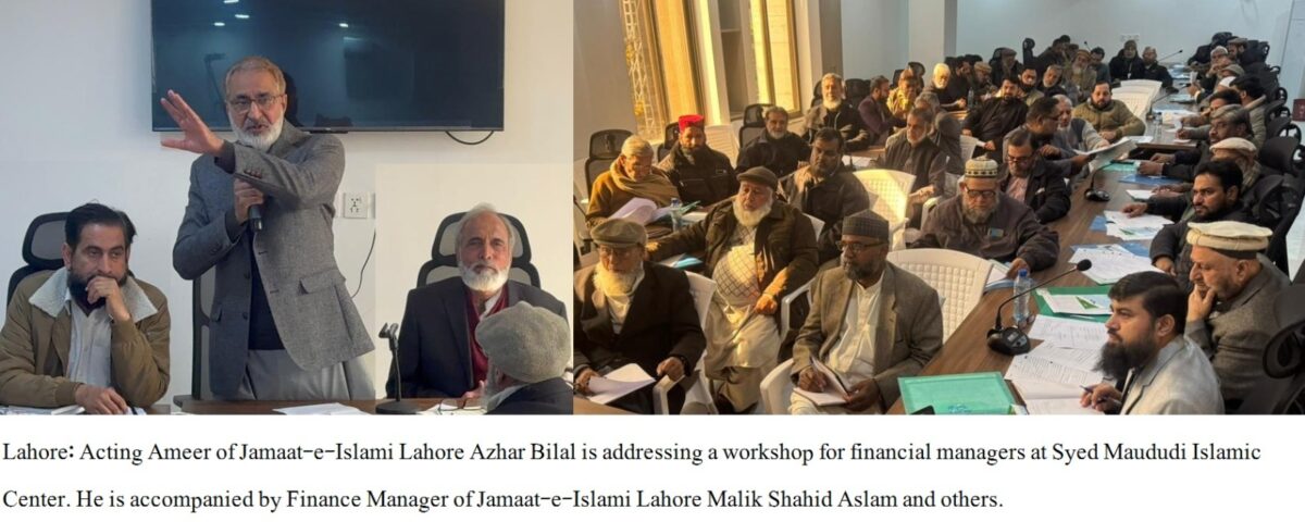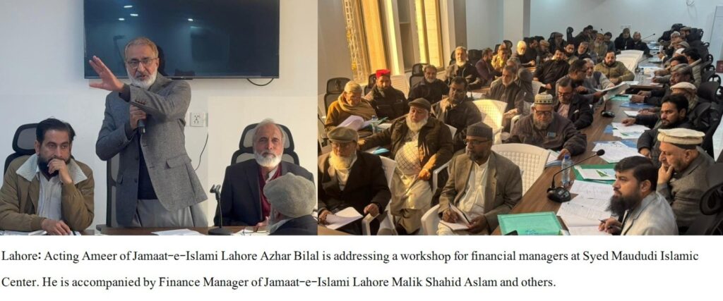 Lahore (Umar Hayat CH)Jamaat-e-Islami Lahore conducted a comprehensive workshop for financial secretaries at the Syed Maududi Islamic Center. The workshop aimed to provide training to financial secretaries from across the city and to further streamline and enhance the transparency of the party’s financial system.The workshop was attended by Acting Amir of Jamaat-e-Islami Lahore, Azhar Bilal, who led the training session and appreciated the dedication and services of the financial secretaries. He also highlighted the significance of an organized financial campaign for the fiscal year 2026.The session was chaired by Nazim-e-Maliyat (Finance Secretary) Malik Shahid Aslam, who provided participants with a detailed briefing on planning, goals, and strategies for financial campaigns. A comprehensive review of the financial system and campaigns of 2025 was also conducted, during which participants shared their experiences and suggestions.Financial secretaries from all districts and union councils of Lahore participated, ensuring broad representation and engagement. The workshop emphasized organized financial management, transparency, and accountability to strengthen the financial activities of Jamaat-e-Islami Lahore.At the conclusion of the workshop, the Acting Amir and Finance Secretary addressed participants’ questions and encouraged them to play an active role in planning for the fiscal year 2026. This workshop reflects Jamaat-e-Islami Lahore’s commitment to a robust and transparent financial system.