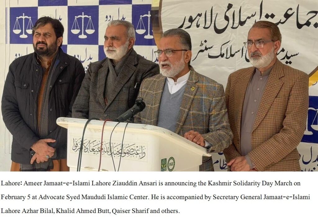 Lahore: Ameer Jamaat-e-Islami Lahore, Ziauddin Ansari Advocate, while addressing a press conference at Syed Maududi Islamic Centre in connection with Kashmir Solidarity Day, February 5, said that Kashmir Solidarity Day is not merely a symbolic occasion but a day to practically reaffirm support for the right of self-determination of the oppressed Kashmiri people. He announced that a grand Kashmir & Palestine Solidarity March will be held on Mall Road Lahore on February 5, which will be led and addressed by Ameer Jamaat-e-Islami Pakistan Hafiz Naeem ur Rehman.He further stated that the Kashmir Solidarity March will commence at 10:30 am from State Bank Chowk, Mall Road Lahore, and will be attended by thousands of men, women and children. He emphasized that political, moral and diplomatic support for the people of Kashmir and Palestine is the national duty of every Pakistani. He urged the Government of Pakistan to raise an effective voice at international forums and align the Kashmir policy with practical measures rather than mere statements.The Ameer Jamaat-e-Islami Lahore also announced that Jamaat-e-Islami will organize an All Parties Conference in Lahore on February 1, in which leaders of all political and religious parties will demonstrate unity and adopt a joint stance on the issues of Kashmir and Palestine.Expressing serious concerns over the government’s policy regarding Basant, Ziauddin Ansari Advocate said that Jamaat-e-Islami is not opposed to cultural activities; however, allowing Basant celebrations in residential areas is tantamount to playing with human lives. He stated that precious lives are being lost due to the use of metallic kite strings, aerial firing and other illegal activities, while government measures have proved ineffective.Referring to the tragic incident at Bhati Chowk, where a mother and daughter lost their lives after falling into an open sewer, he rejected attempts to term it a mere accident, stating that it was a clear case of administrative failure and criminal negligence. He demanded immediate financial assistance for the affected family and urgent measures to secure all open sewerage lines across the city.