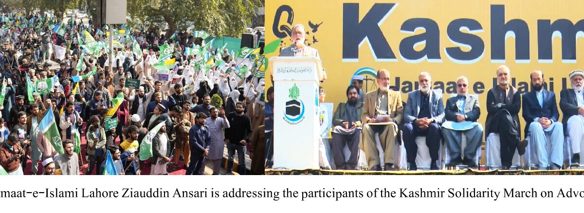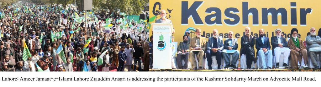 Lahore: Jamaat-e-Islami Lahore organized a massive Kashmir Solidarity March on the occasion of Kashmir Solidarity Day. The march started from the State Bank and concluded at Charing Cross. The march was led by Ameer Jamaat-e-Islami Lahore, Ziauddin Ansari Advocate.The march was attended by Secretary General Jamaat-e-Islami Lahore Azhar Bilal, Deputy Ameers Khalid Ahmed Butt, Engineer Ikhlaq Ahmed, Malik Shahid Aslam, Chaudhry Muhammad Shaukat, Waqas Ahmed Butt, Hafiz Kazim Raza (Shia Ulema Council), Deputy Secretaries Aamir Nisar Khan, Mirza Shoaib Yaqoob, Qaiser Sharif, Secretary JI Youth Lahore Hamza Bilal, and women leaders including Sameena Saeed, Dr. Samiha Raheel Qazi, Uzma Imran, Rashida Shaheen, Zaib Asif, Shazia Abdul Qadir, Shaima Usman, along with central, provincial and district leadership of Jamaat-e-Islami. A large number of women, youth, children, senior citizens and citizens from across Lahore participated in the march. Participants carried placards and banners bearing slogans such as “Kashmir is the jugular vein of Pakistan,” “Kashmir Will Become Pakistan,” and calling for the freedom of Palestine and Al-Aqsa Mosque. The atmosphere remained highly charged with enthusiastic chants. Addressing the participants, Ameer Jamaat-e-Islami Lahore Ziauddin Ansari Advocate stated that the government must not limit Kashmir Solidarity Day to symbolic events, but should take concrete and effective steps to support the Kashmiri people’s right to self-determination. He emphasized that February 5 should not be confined to speeches alone; rather, the nation should be informed about tangible progress made toward the freedom of Kashmir. He categorically rejected participation in the Gaza Peace Board and warned that if any ruler or general utters even a single word in support of Israel, the Pakistani nation will respond forcefully and make an example of it. He further said that the people of Lahore have proven they stand shoulder to shoulder with the oppressed people of Kashmir and Palestine. Without the freedom of Kashmir, the completion of Pakistan remains incomplete. Kashmir and Palestine, he said, are shared issues of the Muslim Ummah and require a clear, firm, and effective strategy for resolution.Deputy Ameer Jamaat-e-Islami Lahore Khalid Ahmed Butt said that the sacrifices of the Kashmiri and Palestinian people will not go in vain and that their struggle for freedom will ultimately succeed. Secretary Jamaat-e-Islami Lahore Azhar Bilal criticized the rulers for relying on verbal statements instead of practical measures since 2019.