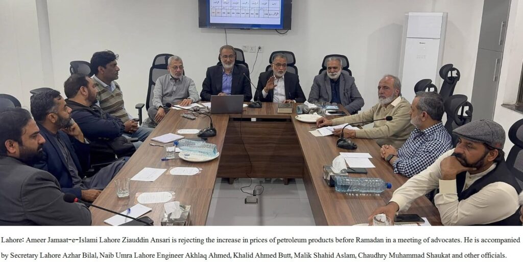 LAHORE (UMAR HAYAT CH) Ziauddin Ansari Ameer of Jamaat-e-Islami Lahore and Advocate, has strongly condemned the increase in petroleum product prices ahead of the holy month of Ramadan, warning that the move will trigger a wave of inflation.He stated that the government, under the pretext of providing “relief,” is imposing severe burdens of rising prices on the poor and ordinary citizens. Rising inflation, unemployment, and escalating utility bills have already strained the financial capacity of the common man. The increase in petroleum prices will inevitably lead to higher transport fares and a surge in the cost of essential food items, creating serious difficulties for the poor and middle-income groups.Ziauddin Ansari emphasized that raising prices just before Ramadan will make it difficult for families to meet even the basic needs of Sehri and Iftar. He warned that unscrupulous profiteers and hoarders will take advantage of the situation, creating artificial shortages and exploiting the public.He urged the government to reconsider this unjust decision and provide genuine relief to the people during the blessed month of Ramadan.These remarks were made during an important meeting of Jamaat-e-Islami Lahore officials, condemning the petroleum price hike. The meeting was attended by Secretary General Azhar Bilal, Naib Ameers Malik Shahid Aslam, Khalid Ahmed Butt, Engineer Ikhlaq Ahmed, Chaudhry Muhammad Shaukat, Deputy Secretaries of Lahore, District Ameers, Secretaries, and Heads of Departments.