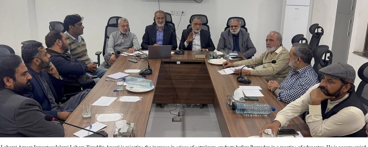 LAHORE (UMAR HAYAT CH) Ziauddin Ansari Ameer of Jamaat-e-Islami Lahore and Advocate, has strongly condemned the increase in petroleum product prices ahead of the holy month of Ramadan, warning that the move will trigger a wave of inflation.He stated that the government, under the pretext of providing “relief,” is imposing severe burdens of rising prices on the poor and ordinary citizens. Rising inflation, unemployment, and escalating utility bills have already strained the financial capacity of the common man. The increase in petroleum prices will inevitably lead to higher transport fares and a surge in the cost of essential food items, creating serious difficulties for the poor and middle-income groups.Ziauddin Ansari emphasized that raising prices just before Ramadan will make it difficult for families to meet even the basic needs of Sehri and Iftar. He warned that unscrupulous profiteers and hoarders will take advantage of the situation, creating artificial shortages and exploiting the public.He urged the government to reconsider this unjust decision and provide genuine relief to the people during the blessed month of Ramadan.These remarks were made during an important meeting of Jamaat-e-Islami Lahore officials, condemning the petroleum price hike. The meeting was attended by Secretary General Azhar Bilal, Naib Ameers Malik Shahid Aslam, Khalid Ahmed Butt, Engineer Ikhlaq Ahmed, Chaudhry Muhammad Shaukat, Deputy Secretaries of Lahore, District Ameers, Secretaries, and Heads of Departments.