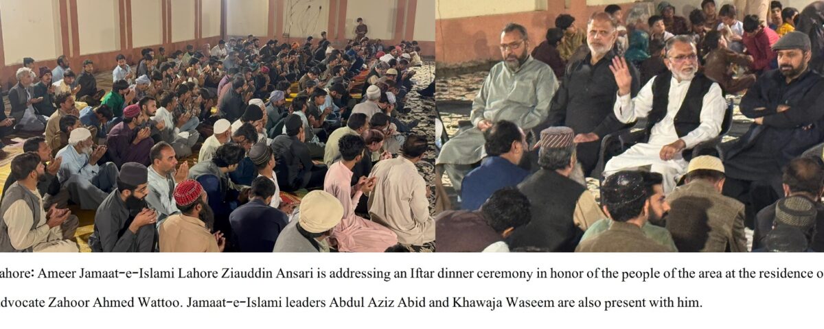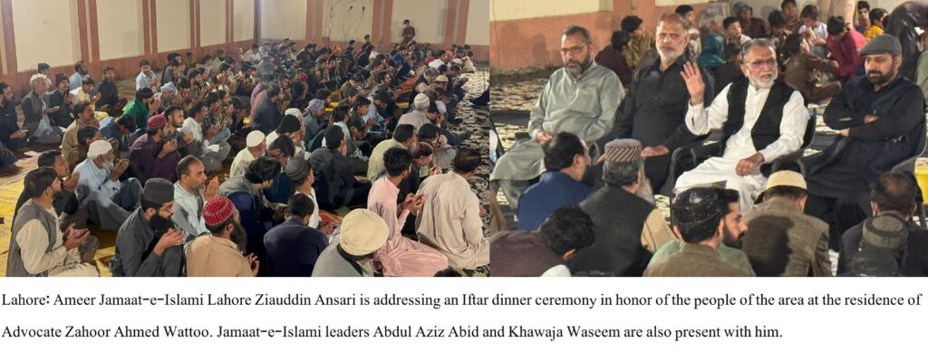 Lahore: Ameer Jamaat-e-Islami Lahore Zia ud Din Ansari Advocate, stated that Ramadan is a sacred month of blessings, mercy, and forgiveness that teaches the values of piety, patience, sacrifice, and selflessness. He expressed these views while addressing an Iftar dinner hosted in honor of local residents at the residence of District West President for Political Affairs Zahoor Ahmed Watto. He emphasized that the true message of Ramadan is to promote brotherhood, love, mutual respect, and social harmony. Given the prevailing economic challenges, it is imperative that along with offering prayers and, special attention be given to the poor, needy, white-collar families, and close relatives. It should never happen that our dining tables are filled with a variety of dishes while our neighbors or relatives lack even the basic necessities for Sehri and Iftar.Ameer Jamaat-e-Islami Lahore urged well-off individuals to extend generous support to the deserving and remain aware of the circumstances of those around them. Addressing the youth, he encouraged them to make Ramadan a source of self-reform, character building, and social service in order to help build a moral, welfare-oriented, and strong society.The event was attended by Jamaat-e-Islami leaders Abdul Aziz Abid, Khawaja Waseem, along with a large number of local residents, including elders, youth, and children, who reaffirmed their commitment to unity and community service.