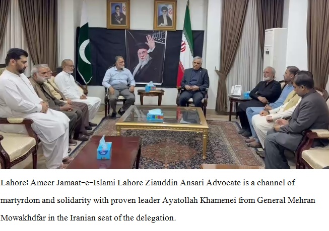 Lahore: Ameer Jamaat-e-Islami Lahore Zia-ud-Din Ansari Advocate visited the Iranian Consulate along with a delegation and held a meeting with the Consul General of Iran Mehran Mowakhedfar.The delegation of Jamaat-e-Islami expressed profound grief and sorrow over the martyrdom of Iran’s Supreme Leader Ayatollah Khamenei , and conveyed heartfelt condolences and solidarity to the government and people of Iran. The Ameer also recorded his remarks in the condolence book placed at the Consulate and paid tribute to the services of the martyred leader.Speaking on the occasion, Zia-ud-Din Ansari Advocate stated that the martyrdom of Ayatollah Khamenei is not only a loss for Iran but for the entire Muslim Ummah. He strongly condemned the aggressive actions by the United States and Israel against Iran, describing them as a threat to global peace and stability.He further stated that the people of Pakistan stand firmly with Iran in this difficult time, acknowledging Iran’s role in defending the oppressed Palestinian Muslims. He urged the Pakistani leadership to adopt a clear and unequivocal stance in support of Iran.The Ameer Jamaat-e-Islami Lahore also offered special prayers for the security, stability, and success of Iran.The delegation included Secretary General Jamaat-e-Islami Lahore Azhar Bilal, Deputy Ameers Engineer Akhlaq Ahmad, Khalid Ahmad Butt, Malik Shahid Aslam, Deputy Secretary Rashid Daud, President Public Aid Committee Qaiser Sharif, and President JI Youth Lahore Jibran Butt.