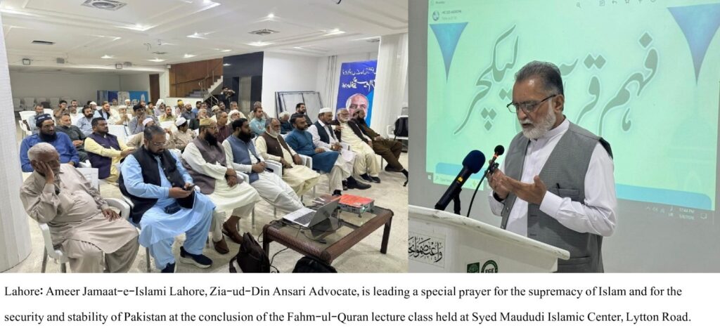 Lahore: Ameer Jamaat-e-Islami Lahore, Zia-ud-Din Ansari Advocate, has said that the path of the Qur’an and Sunnah and the unity of the Muslim Ummah are the only real solutions to the challenges facing Muslims today. Jamaat-e-Islami will continue its peaceful and democratic struggle for the establishment of a just system based on the Qur’an and Sunnah in the country.He expressed these views while addressing a Fahm-ul-Qur’an lecture class at Syed Maududi Islamic Center, Lytton Road, Lahore. He said that the Muslim world is currently facing serious challenges and Muslims in different regions are being subjected to oppression.He stated that Iran has represented the sentiments of the Muslim Ummah by standing against the aggression of the United States and Israel. He added that Muslims in Palestine, Lebanon, Iran, and Kashmir are facing increasing hardships, which is a matter of serious concern for the entire Ummah.Zia-ud-Din Ansari Advocate emphasized that in the current situation, the Muslim Ummah must rise above differences and demonstrate unity and solidarity. He stressed that understanding the teachings of the Qur’an and implementing them in both individual and collective life is the need of the hour.He further said that Jamaat-e-Islami will continue its efforts to spread the message of the Qur’an and Sunnah and to establish a just Islamic society.