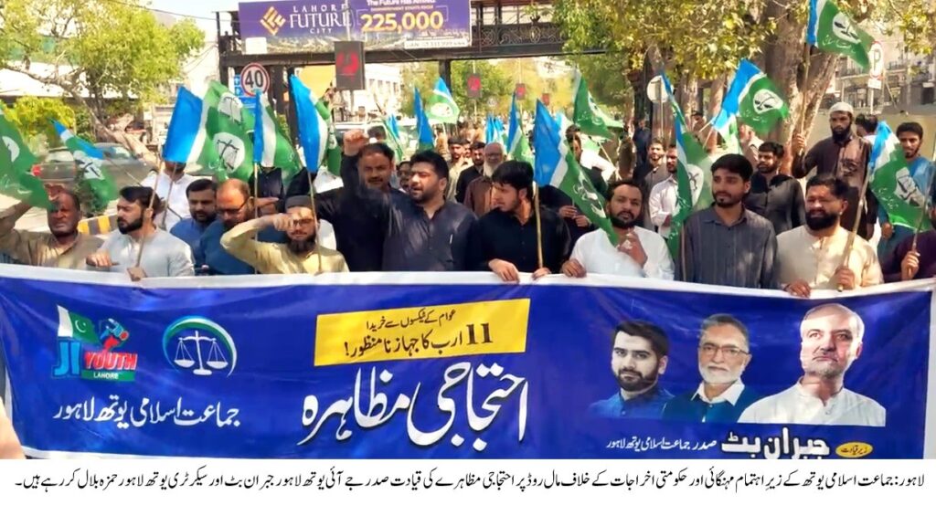 احتجاجی مظاہرے میں ڈپٹی سیکرٹری جماعت اسلامی لاہور عامر نثار خان ، سیکرٹری جے آئی یوتھ حمزہ بلال سمیت نوجوانوں اور کارکنان کی بڑی تعداد نے شرکت کی۔مظاہرین نے حکومت کی شاہ خرچیوں کے خلاف شدید نعرے بازی کی اور کفایت شعاری کے نام پر عوام کو گمراہ کرنے کی مذمت کی۔ احتجاج کے دوران مطالبہ کیا گیا کہ حکومت پنجاب 11 ارب روپے مالیت کا طیارہ فروخت کر کے عوام کو ریلیف فراہم کرے۔ اس موقع پر مظاہرین کی جانب سے چیئرمین سینیٹ کی 9 کروڑ روپے مالیت کی گاڑی فروخت کرنے کا بھی مطالبہ کیا گیا۔ مظاہرین نے عام آدمی کے لیے پٹرول کی قیمتوں میں کمی اور بنیادی اشیائے ضروریہ کی فراہمی یقینی بنانے پر زور دیا۔