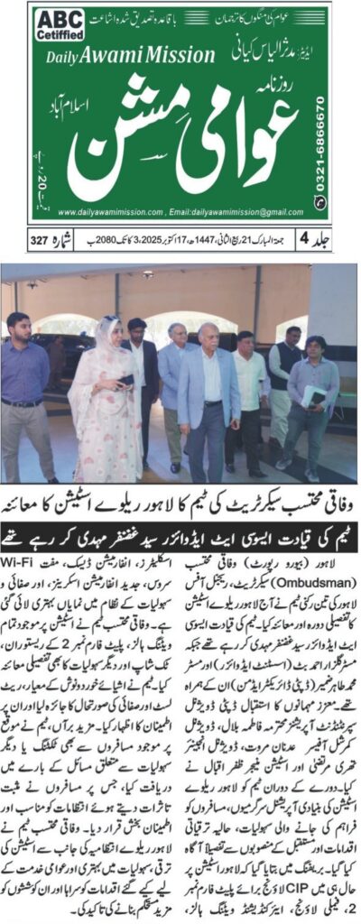 وفاقی محتسب ٹیم نے لاہور ریلوے انتظامیہ کی جانب سے اسٹیشن کی ترقی، سہولیات میں بہتری اور عوامی خدمت کے لیے کیے گئے اقدامات کو سراہا اور ان کوششوں کو مزید مستحکم بنانے کی تاکید کی۔